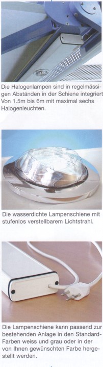 Die Halogen-Lampenschiene ist steckbar und verlangt außer einer Steckdose mit 230 V-Anschluss keine weitere Installation. Sie lässt sich problemlos an den Kasten oder an das Tragrohr einer Markise oder an einer Pergola befestigen. Auch das nachträgliche Anbringen an eine bestehende Anlage ist jederzeit ohne Installationsarbeiten möglich.